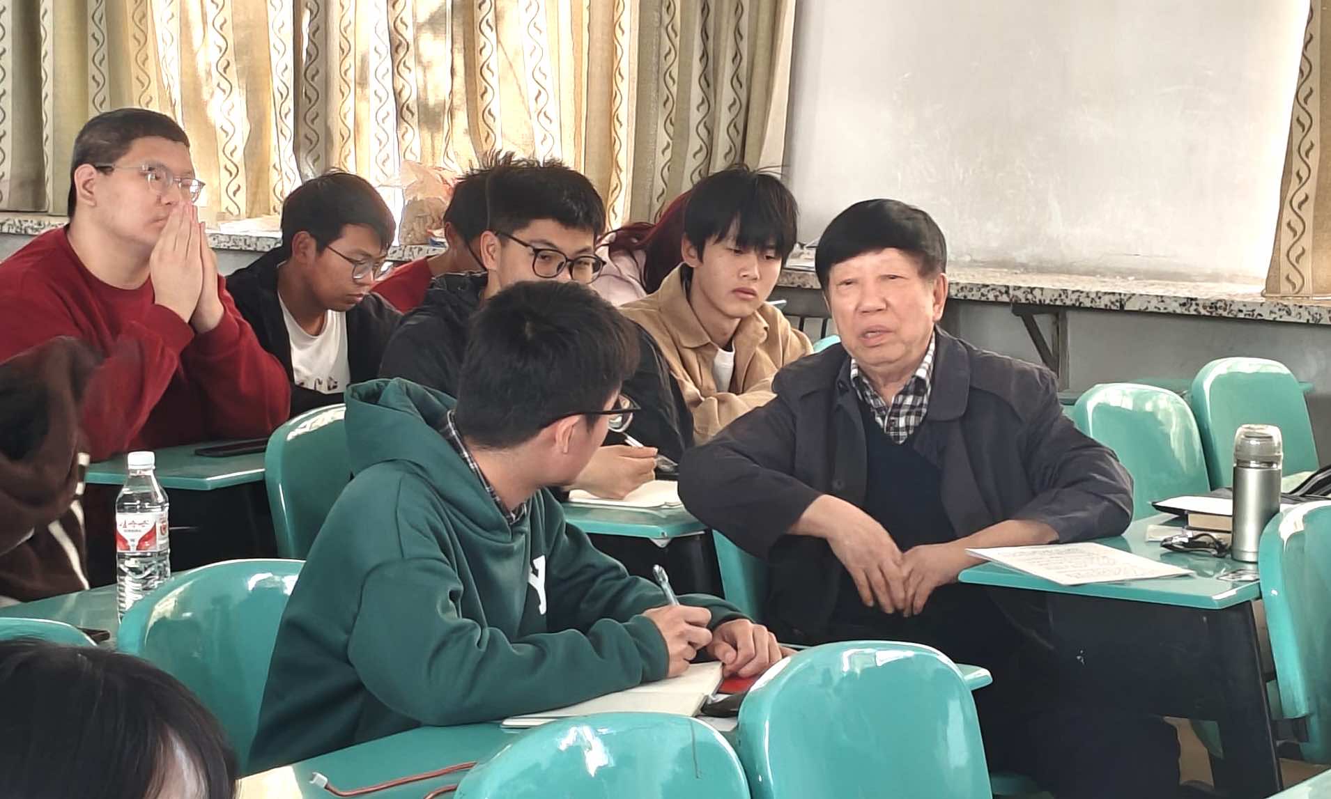在最后一堂课上,丰收老师回答了很多学生的提问,最后以“我的新疆大地”结束了所有授课内容。他以独特视角带领同学们领略新疆的大好河山,从文化、自然、矿产等多个角度表现自己对西北边陲大地——新疆的热爱,同时也在同学心中埋下一颗热爱边疆、热爱祖国的种子。当下课铃声响起时,全体同学自觉起立,向丰收老师鞠躬致谢,感谢丰收老师两个月来的精彩授课。