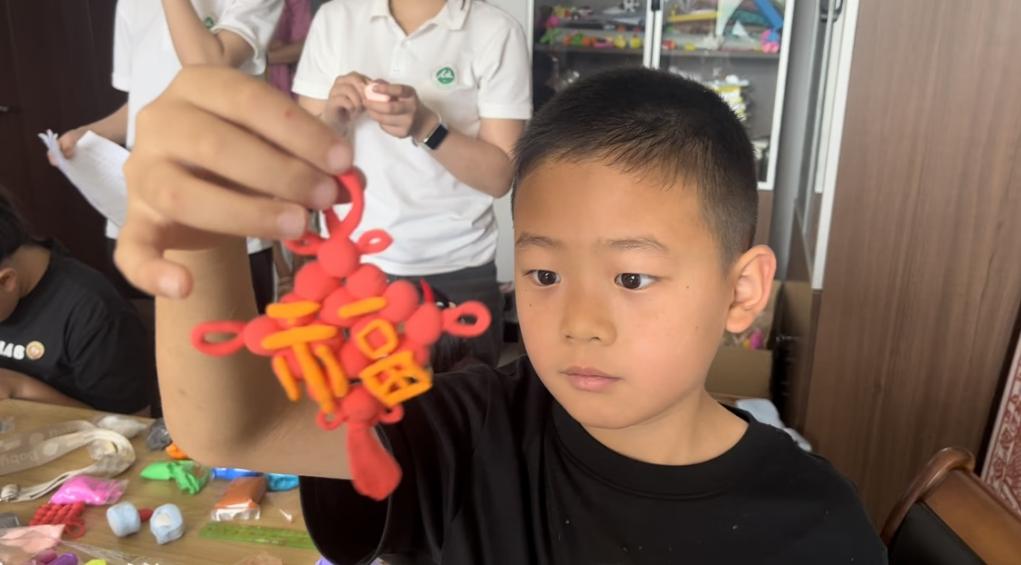 活动中,实践团成员还通过幻灯片讲解中国结的文化内涵,阐释其象征团圆、平安及民族团结的寓意。随后,老师们现场示范粘土捏制技巧,红色粘土在指尖翻转成形,引发孩子们阵阵惊叹。