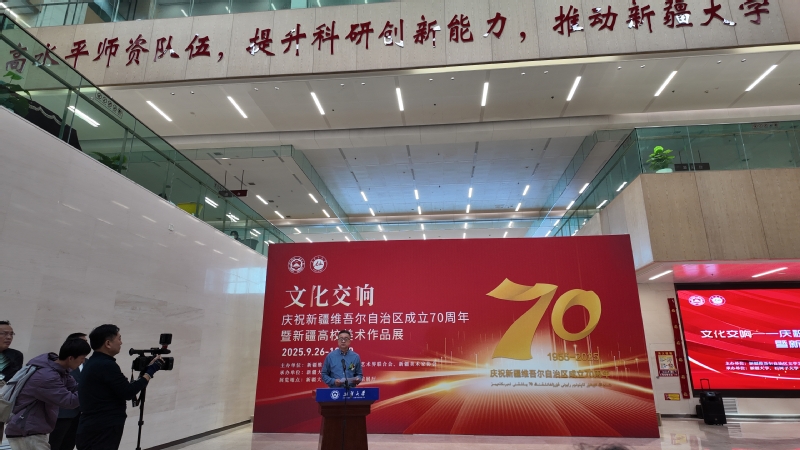 2025年9月26日下午,“文化交响:庆祝新疆维吾尔自治区成立70周年暨新疆高校美术作品展”开幕式在新疆大学博达校区隆重举行。新葡的京集团8814党委书记宋育果带队,副院长杜瑶,美术与设计系副书记李钦曾、副主任杨超一行出席活动,与全疆高校代表共同见证这一文化盛事。
