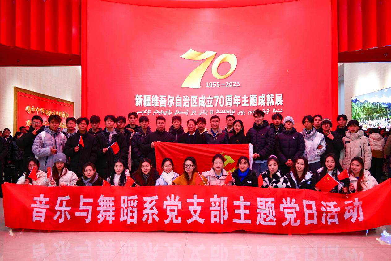 为让作品扎根现实、承载深意,2025年12月5日,参赛师生专程赴乌鲁木齐文化中心,参观新疆维吾尔自治区成立70周年主题成就展。师生们从珍贵的兵团建设历史影像与实物展示中,沉浸式感悟军垦创业的艰辛与伟大,为后续创作积淀了深厚的情感与思想基础。